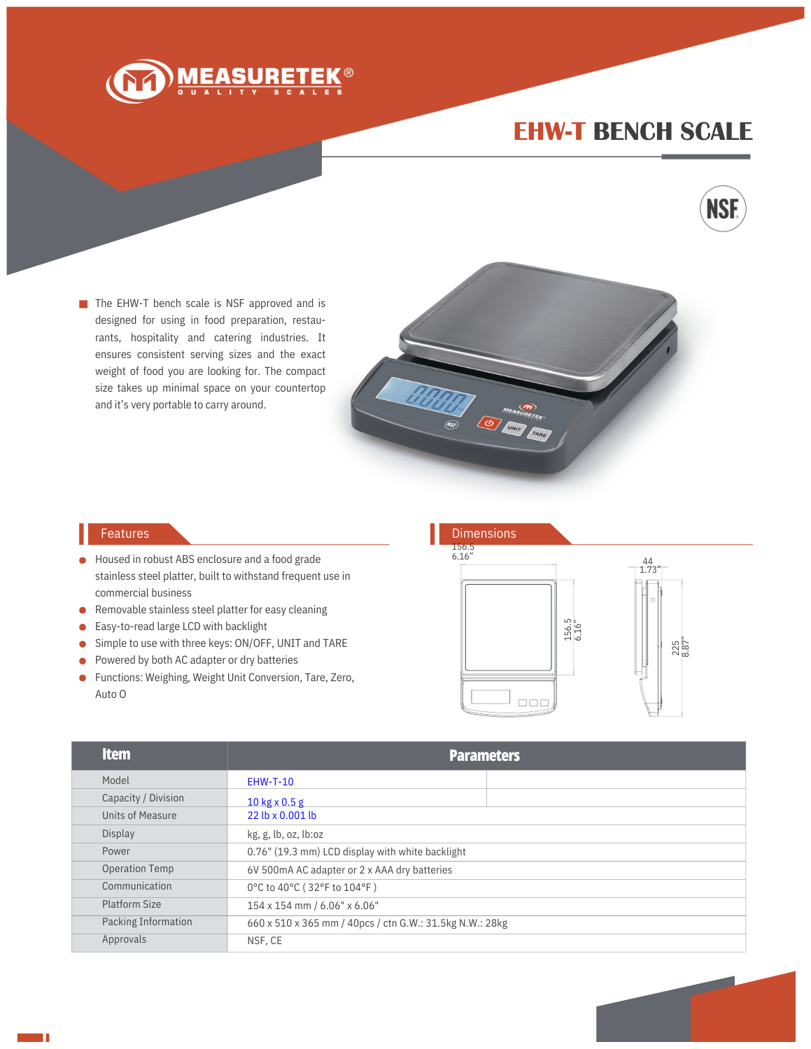Digital, Electronic Kitchen Scales 22lb x 0.001lb / 10kg x 0.001kgΒ Housed in robust ABS enclosure and a food safe grade stainless steel platter, built to withstand frequent use in commercial businessΒ Removable stainless steel platter for easy cleaningΒ Easy-to-read large LCD with backlightΒ Simple to use with three keys ON/OFF, UNIT and TAREΒ Powered by both AC adapter or dry batteriesΒ Functions: Weighing, Weight Unit Conversion, Tare, Zero, Auto Off
