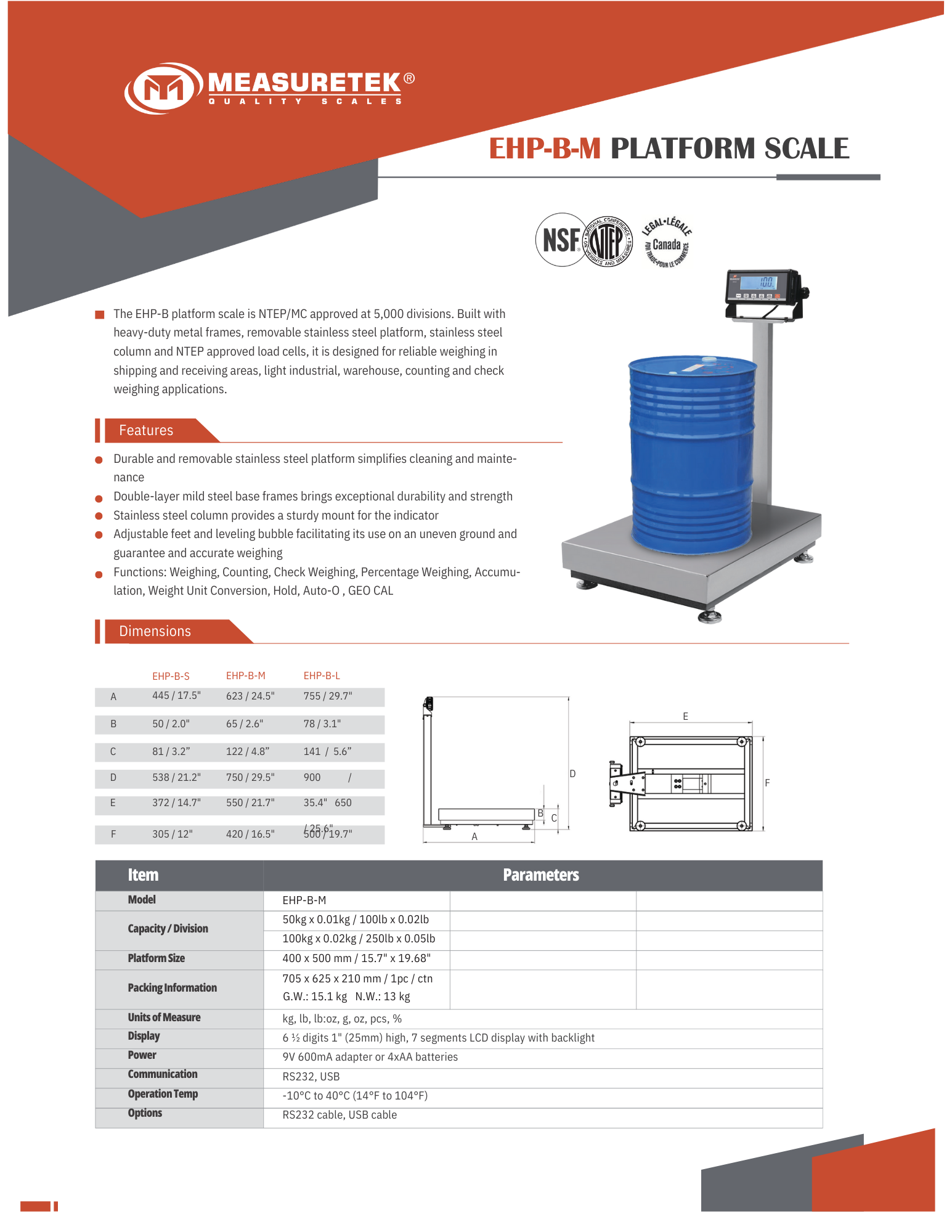 Β 100kg/250lb NSF & NTEP Approved Platform Scale/Shipping Scale/Postal Scale Easy Maintenance: Removable stainless steel platform ensures quick cleaning and hassle-free upkeep. Heavy-Duty Design: Double-layer mild steel base frame delivers outstanding strength and long-lasting durability.Β Stable Support: Stainless steel column provides a solid and reliable mount for the indicator.Β Accurate Setup: Adjustable feet and built-in leveling bubble guarantee precise weighing, even on uneven surfaces.Β Versatile Functions: Includes Weighing, Counting, Check Weighing, Percentage Weighing, Accumulation, Unit Conversion, Hold, Auto-Off, and GEO CAL.