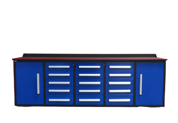This Steelman 10' Garage Cabinet Workbench is a great choice for those looking for a heavy-duty storage solution. With its industrial-grade roller cabinet, you can store a variety of tools and supplies securely and conveniently. The all-welded steel construction and industrial paint finish make this cabinet resistant to rust and corrosion. The drawers come with locks and anti-slip inners, and the pre-cut drawer liners ensure that your items stay in place. The 3-rail sliding system provides a smooth and secure operation, and the secure detents keep the drawers closed. This storage cabinet is perfect for any garage, storage room, basement, hobby room, laboratory, or office. Get organized and maximize your space with this Steelman 10' Garage Cabinet Workbench.