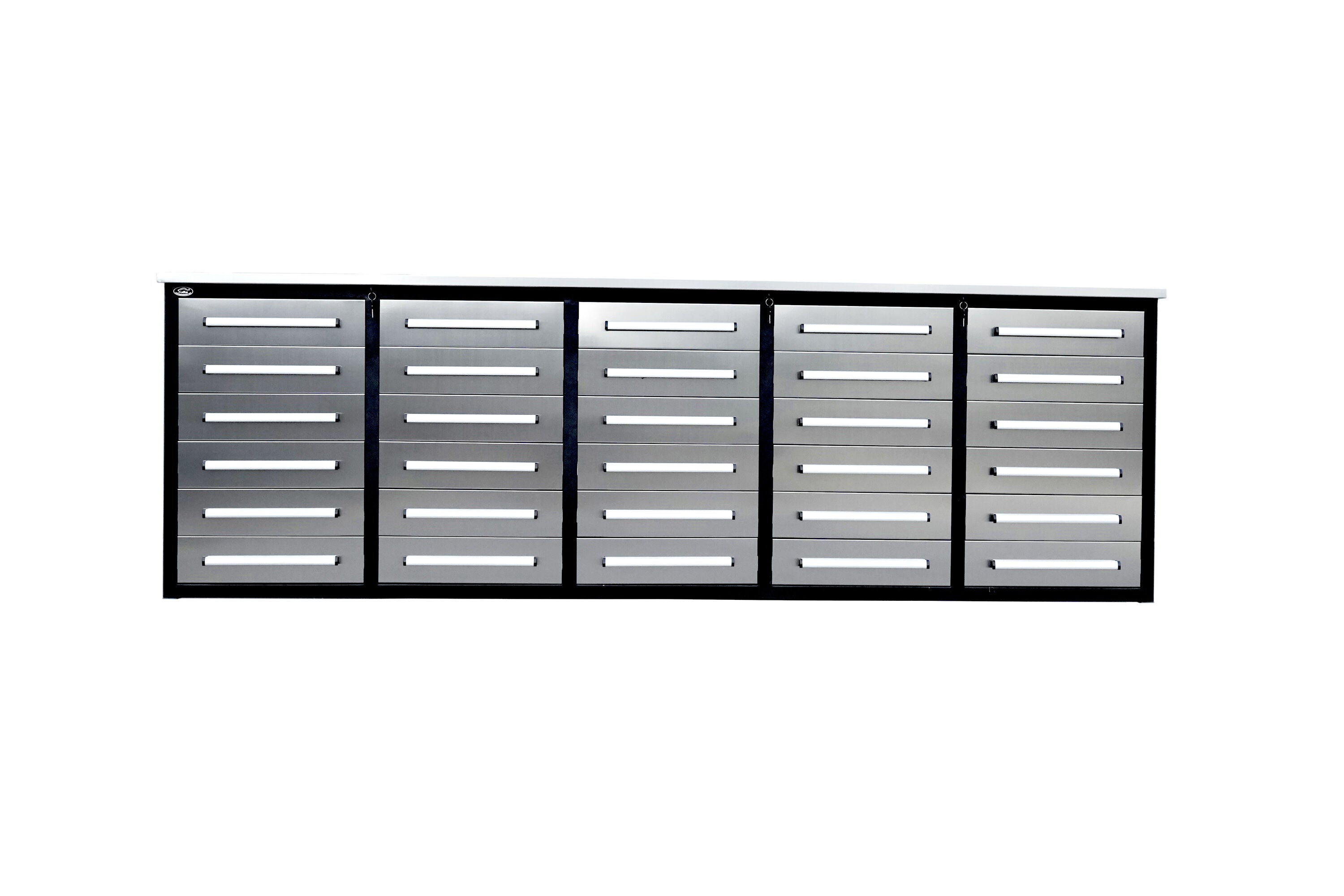 This Steelman 10' Stainless Steel Garage Cabinet Workbench (30 Drawers) is a great choice for those looking for a heavy-duty storage solution. With its industrial-grade roller cabinet, you can store a variety of tools and supplies securely and conveniently. The stainless-steel finish is durable, easy to clean, and looks great in any garage. The drawers come with locks and anti-slip inners, and the pre-cut drawer liners ensure that your items stay in place. The 3-rail sliding system provides a smooth and secure operation, and the secure detents keep the drawers closed. This storage cabinet is perfect for any garage, storage room, basement, hobby room, laboratory, or office. Get organized and maximize your space with this Steelman 10' Stainless Steel Garage Cabinet Workbench (30 Drawers).